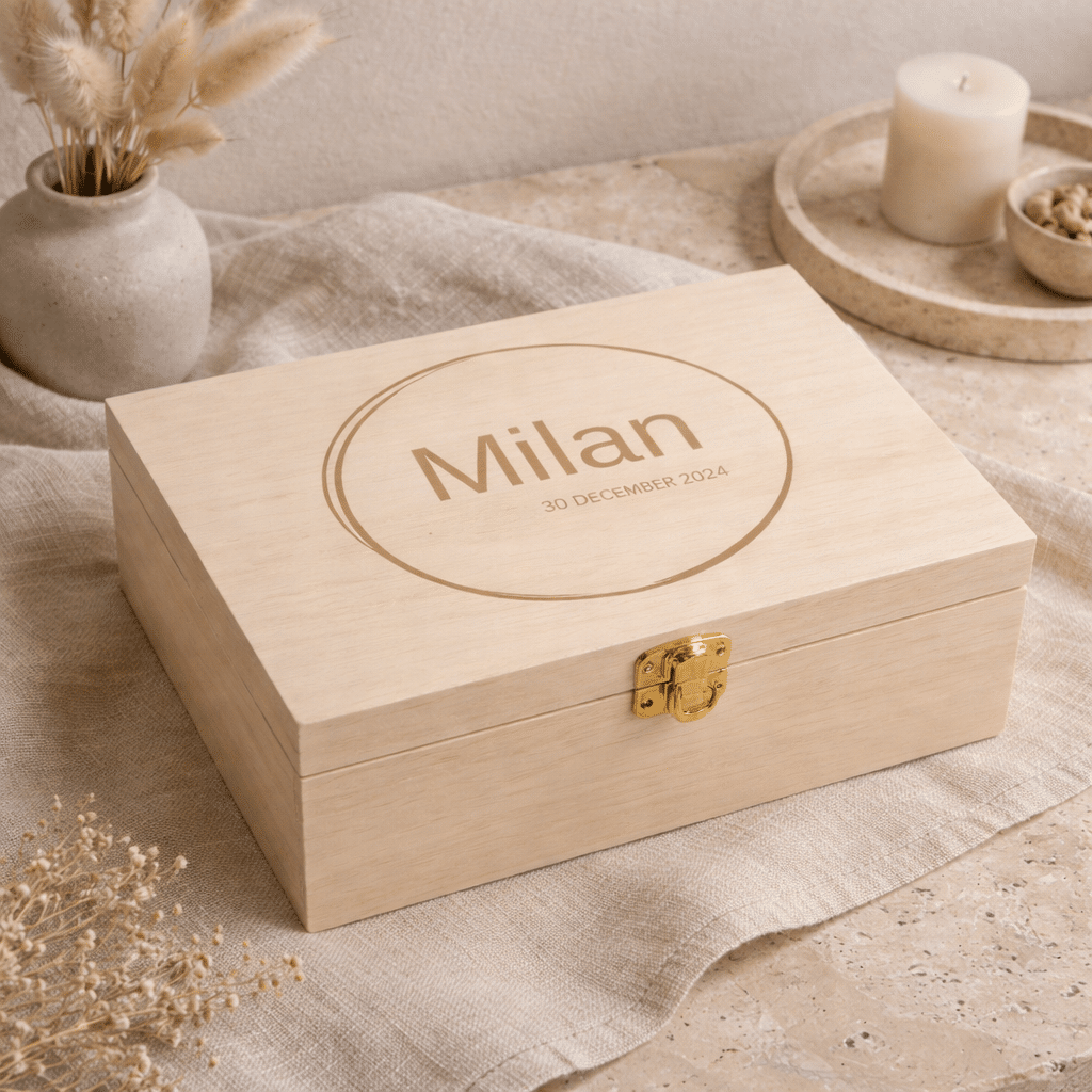 Bewaar de mooiste en meest dierbare herinneringen van je kindje in dit prachtige gepersonaliseerde houten bewaardoosje met naam. Dit stijlvolle doosje is gemaakt van natuurlijk hout en voorzien van een naam in warme bruine letters, wat zorgt voor een tijdloze en rustige uitstraling in Japandi stijl.
