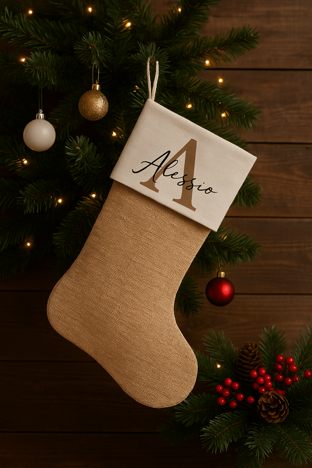 De natuurlijke beige tint en de stijlvolle opdruk met naam geven de sok een rustige, tijdloze uitstraling die past in elk interieur. Hang hem aan de open haard, trapleuning of kinderkamer voor een knusse kerstsfeer.