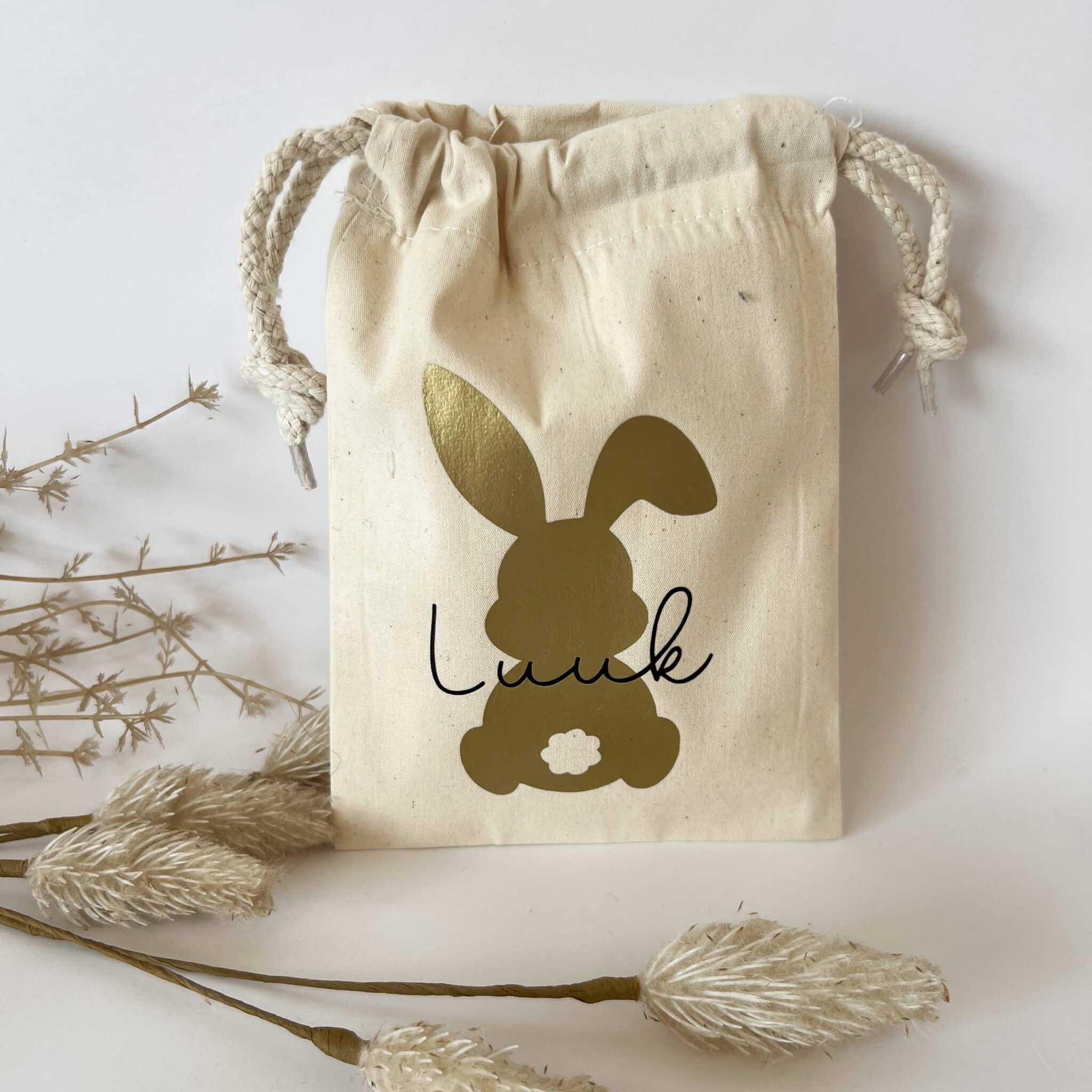 Het paaszakje is van stevig katoen, met gouden opdruk & de naam in het zwart. Het formaat is 15 x 20 cm.