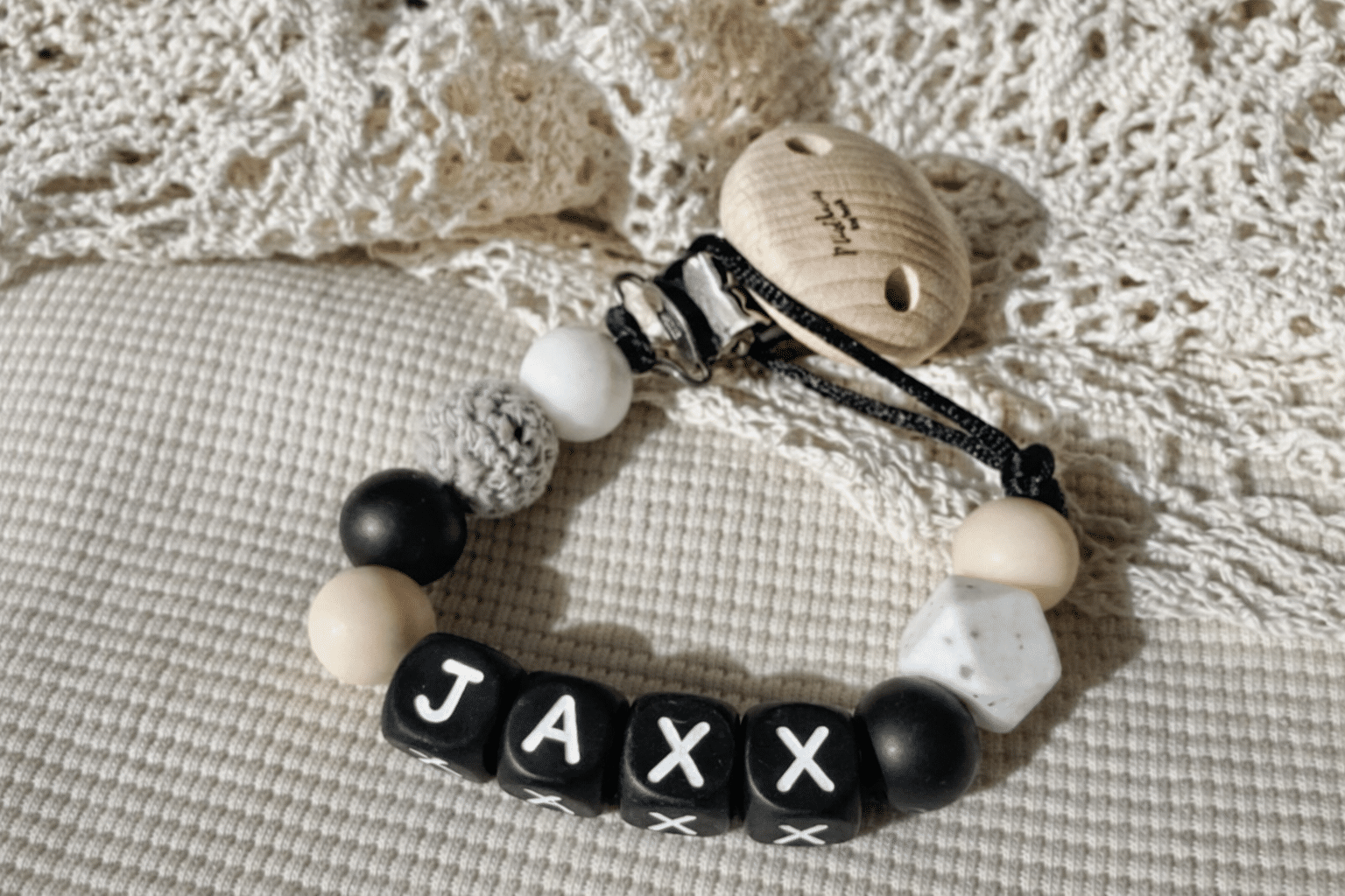 Speenkoord met naam ‘Jaxx’ – Zwart / Wit / Grijs