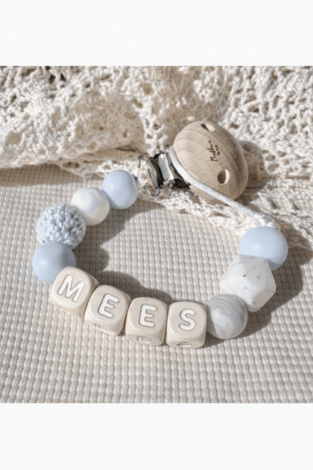 Speenkoord met naam ‘Mees’ – Baby blauw
