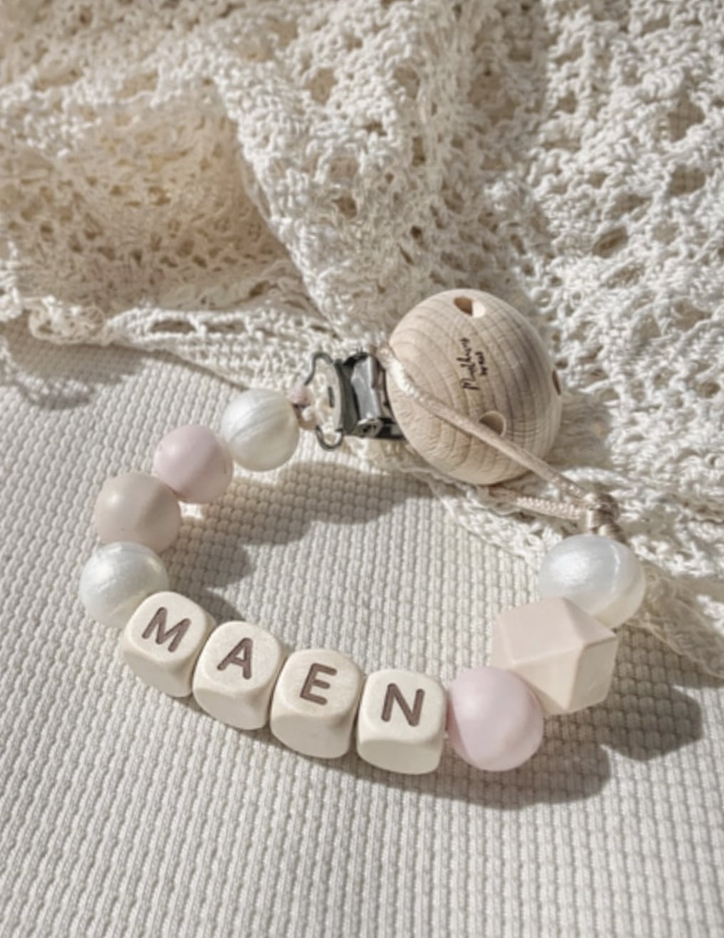 Speenkoord met naam ’Maen’ – Parelmoer/beige/roze